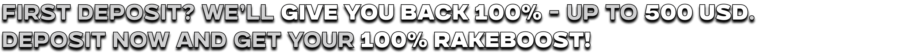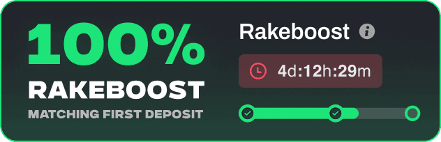 The Rakeboost bonus is available exclusively on your first deposit. To qualify, your deposit must meet the minimum deposit requirement in USD or cryptocurrency equivalent at the time of blockchain confirmation. Only one Rakeboost bonus per user, household, IP address, and payment method.